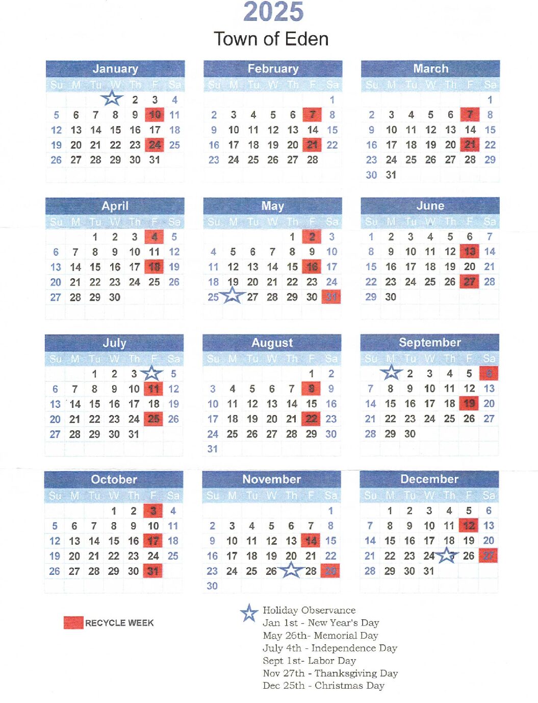 The Town Board meets the second (2nd) Monday of every month at 7:00 p.m. The meetings are held at the Eden Community Center, located at 104 Pine St., Eden, WI 53019.