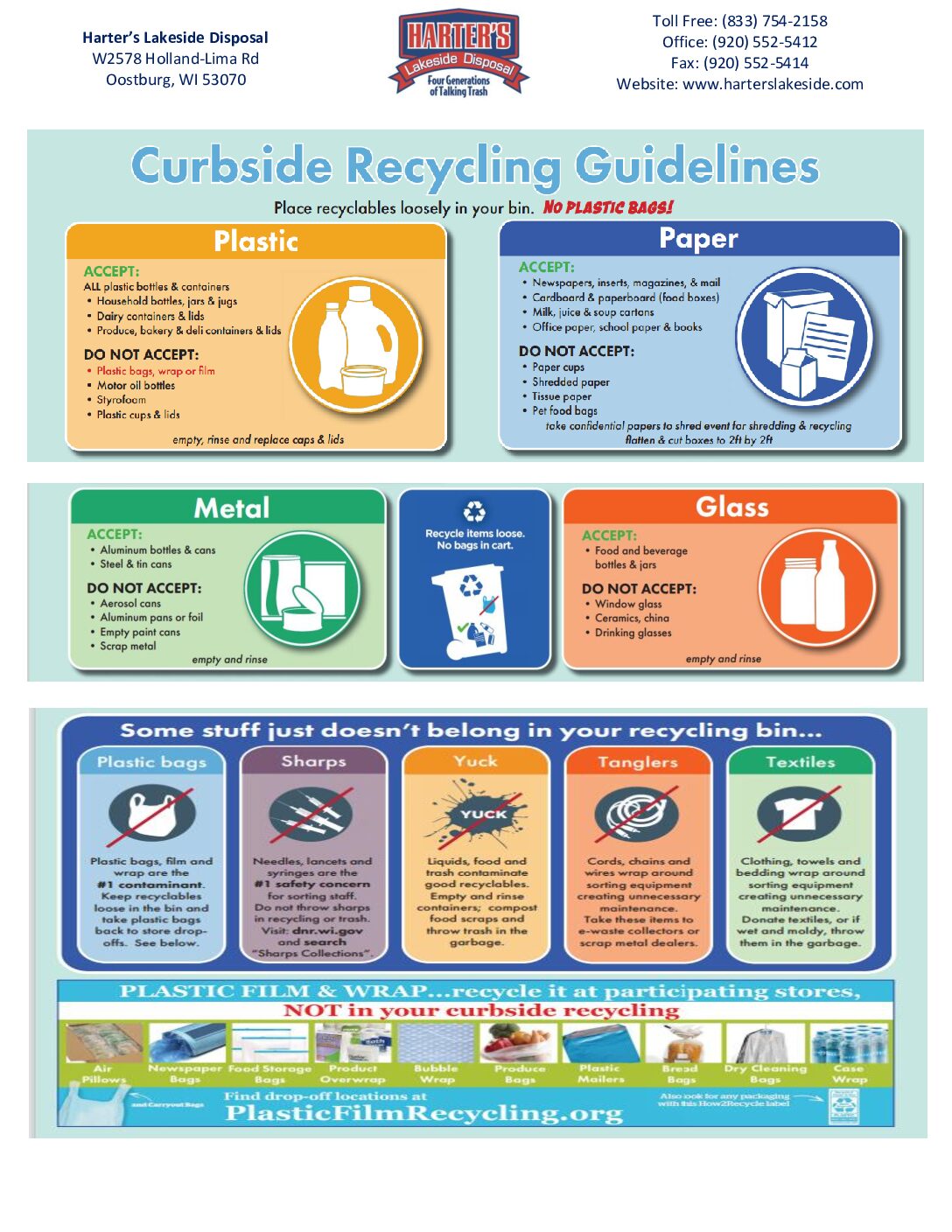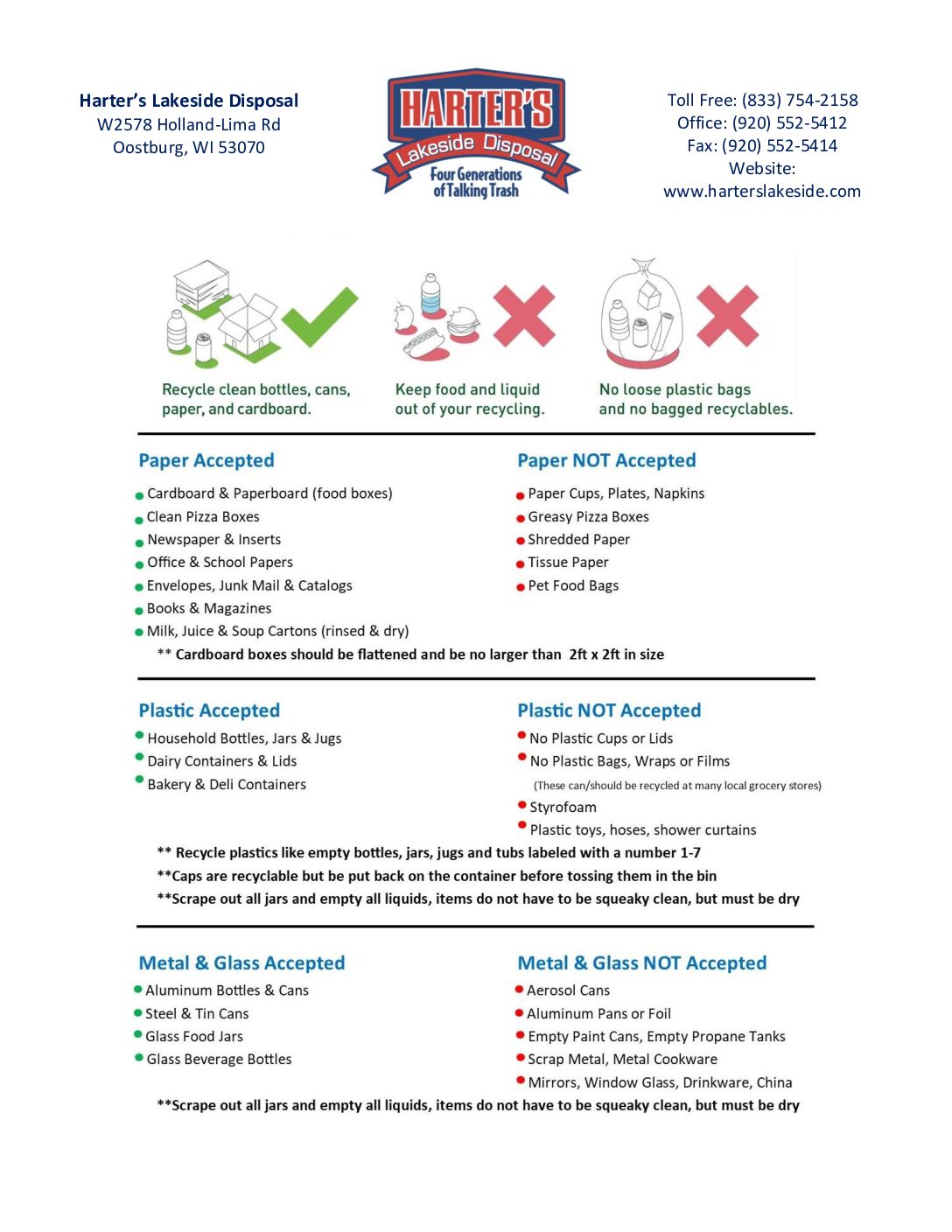 Garbage is picked up weekly on Fridays. Recyclables are picked up every other week. Please see the brochure below for the dates for recyclable pickups. In the event that a Holiday occurs during the week, Garbage/Recyclables will be picked up on Saturday. Please have your containers at curbside by 6:00 am.